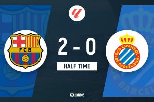 半场-巴萨2-0西班牙人 费兰双响+破13场球荒亚马尔两助攻