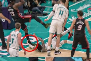 上半场,黄蜂主将拉梅洛·鲍尔用手扒了热火球星阿德巴约脚后跟致其倒地受伤,后者返回更衣室,本场回归成疑!