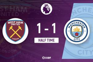 上半场伤停补时2分钟,半场结束,曼城暂1-1西汉姆联。