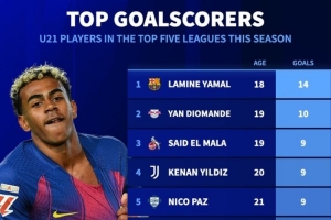 体育资讯3月16日讯 德转列五大联赛U21球员本赛季联赛进球榜,亚马尔14球居首,扬·迪奥曼德10球第二。